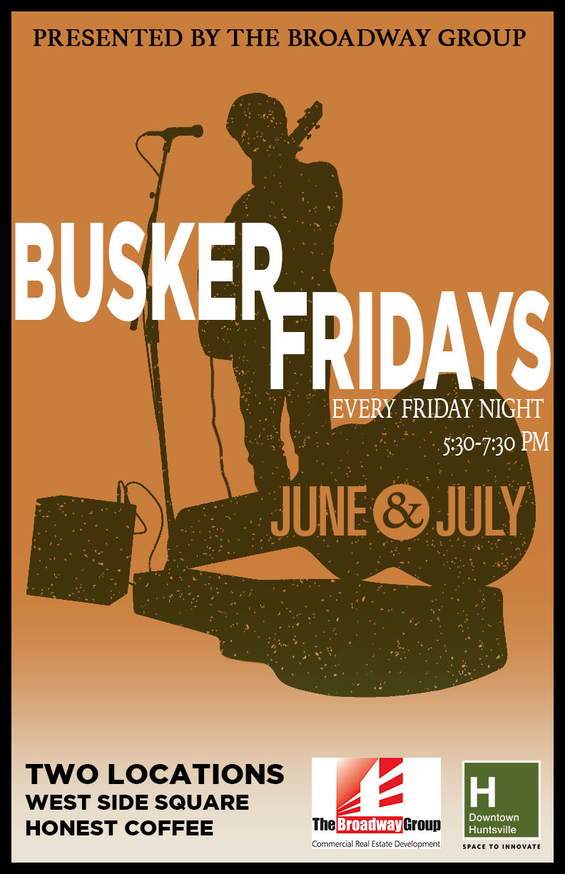 Huntsville has so many talented artists and now through July you can enjoy a variety of entertainment. Every Friday in June and July buskers will be outside Honest Coffee and on Westside Square performing. Come grab a drink, sit back, relax, and enjoy!