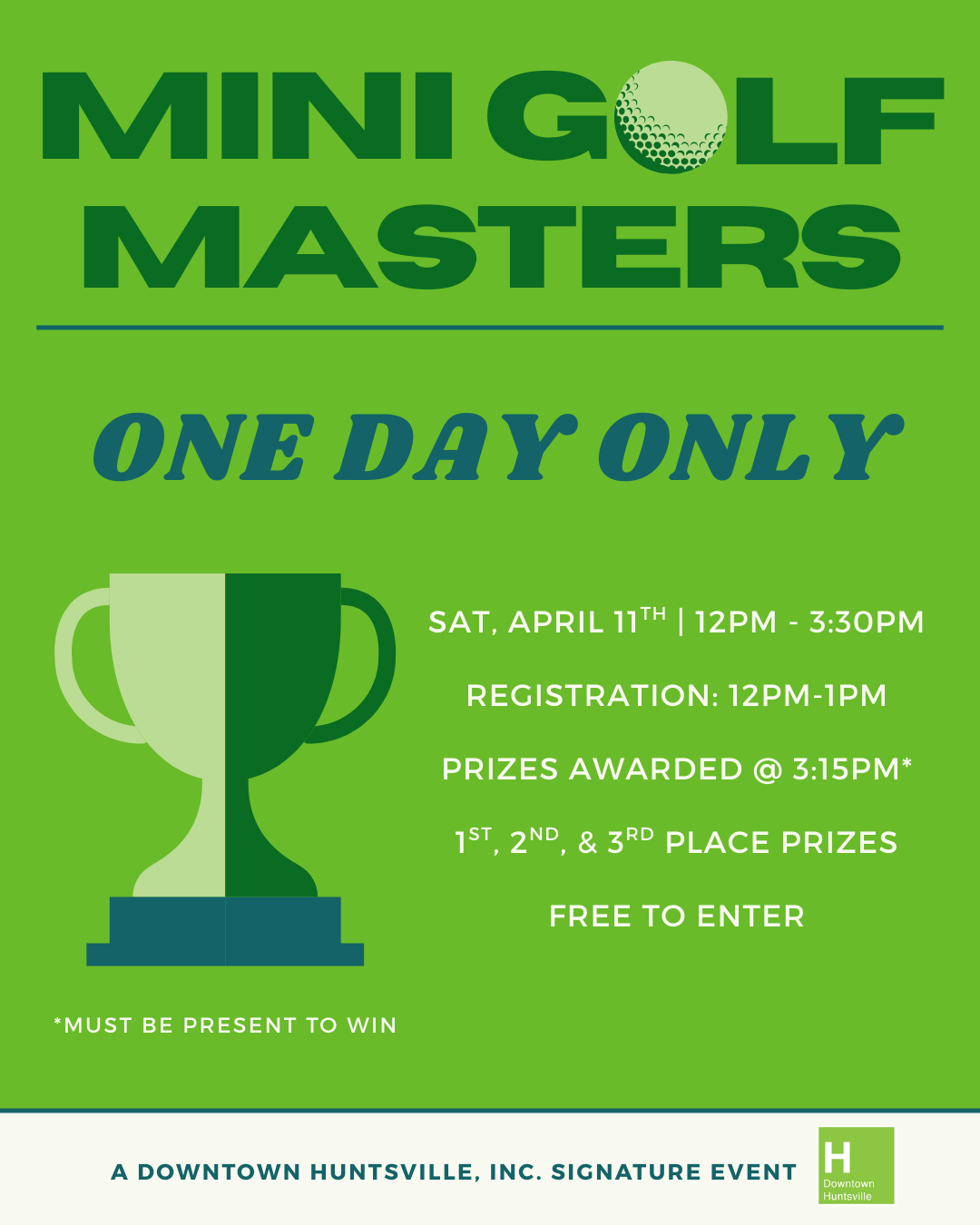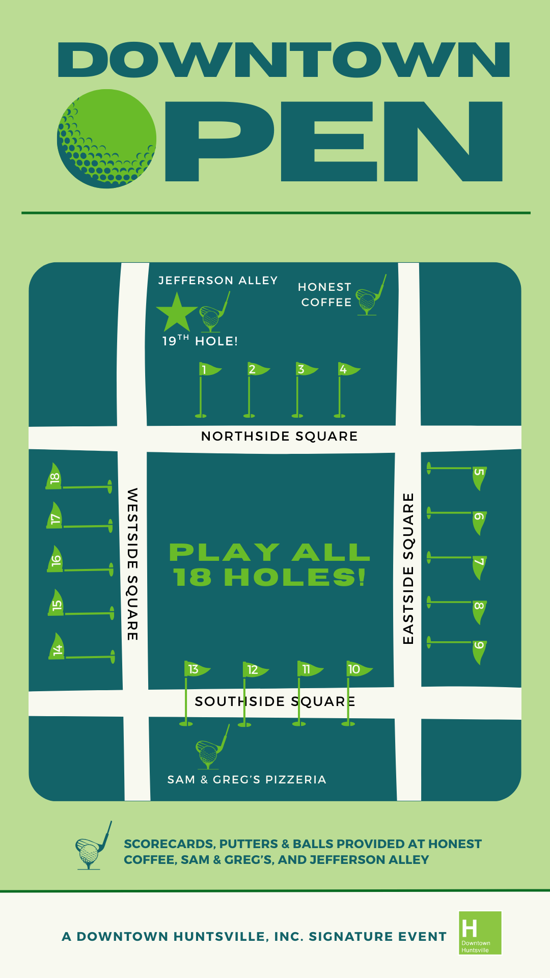 Downtown Huntsville, Inc. (DHI) will be transforming the courthouse square into a free putt-putt course–open to everyone, anytime! Enjoy 18 holes sponsored by Huntsville businesses, and celebrate your completion of the course with a drink at the official 19th Hole in Jefferson Alley.